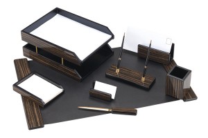 Komplektā ietilpst: galda segums 66x42 cm, vēstuļu nazis, vizītkaršu turētājs, pildspalvu turētājs, 2 plauktiņi, trauciņš pildspalvām-zīmuļiem, piezīmju papīra paliktnis un vēstuļu turētājs. |